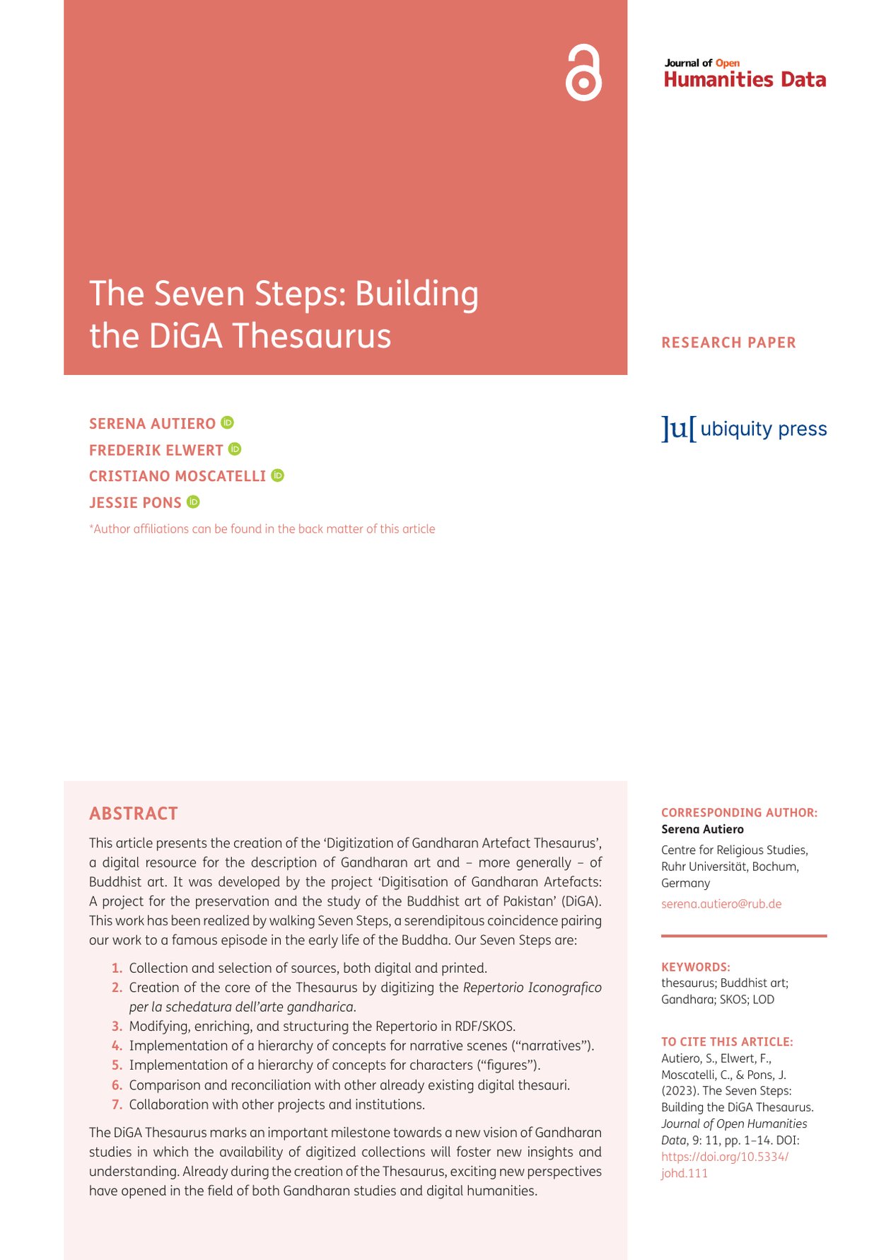 This article presents the creation of the ‘Digitization of Gandharan Artefact Thesaurus’, a digital resource for the description of Gandharan art and – more generally – of Buddhist art. It has been realized by walking Seven Steps, a serendipitous coincidence pairing our work to a famous episode in the early life of the Buddha.